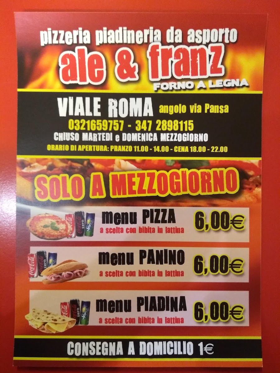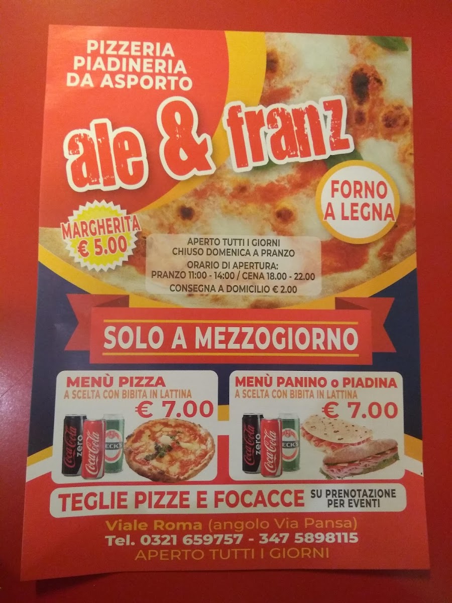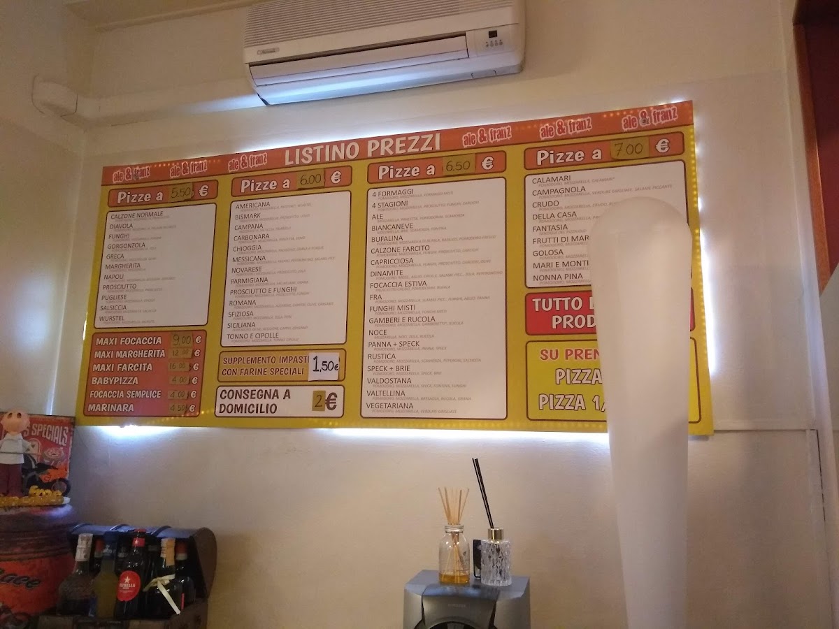 Welcome to Ale & Franz, a charming pizza takeaway nestled in the heart of Novara, Italy. Known for its authentic Italian offerings, the menu boasts a delightful selection of pizzas baked to perfection in a traditional fire oven. Signature creations like the Margherita and the savory Parmigiana showcase fresh, high-quality ingredients such as mozzarella and basil, while innovative toppings provide a creative twist. Prices are remarkably accessible, ensuring that a delicious meal is within everyone's reach.
