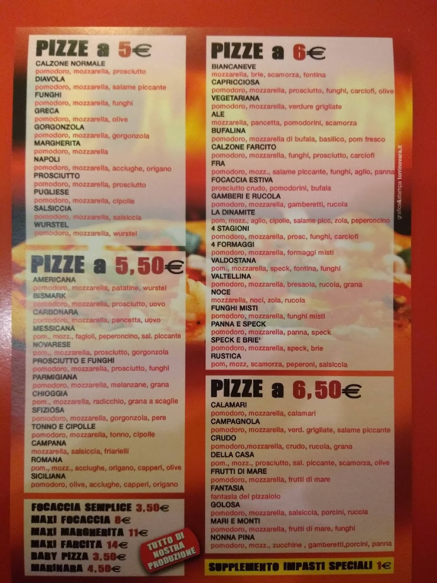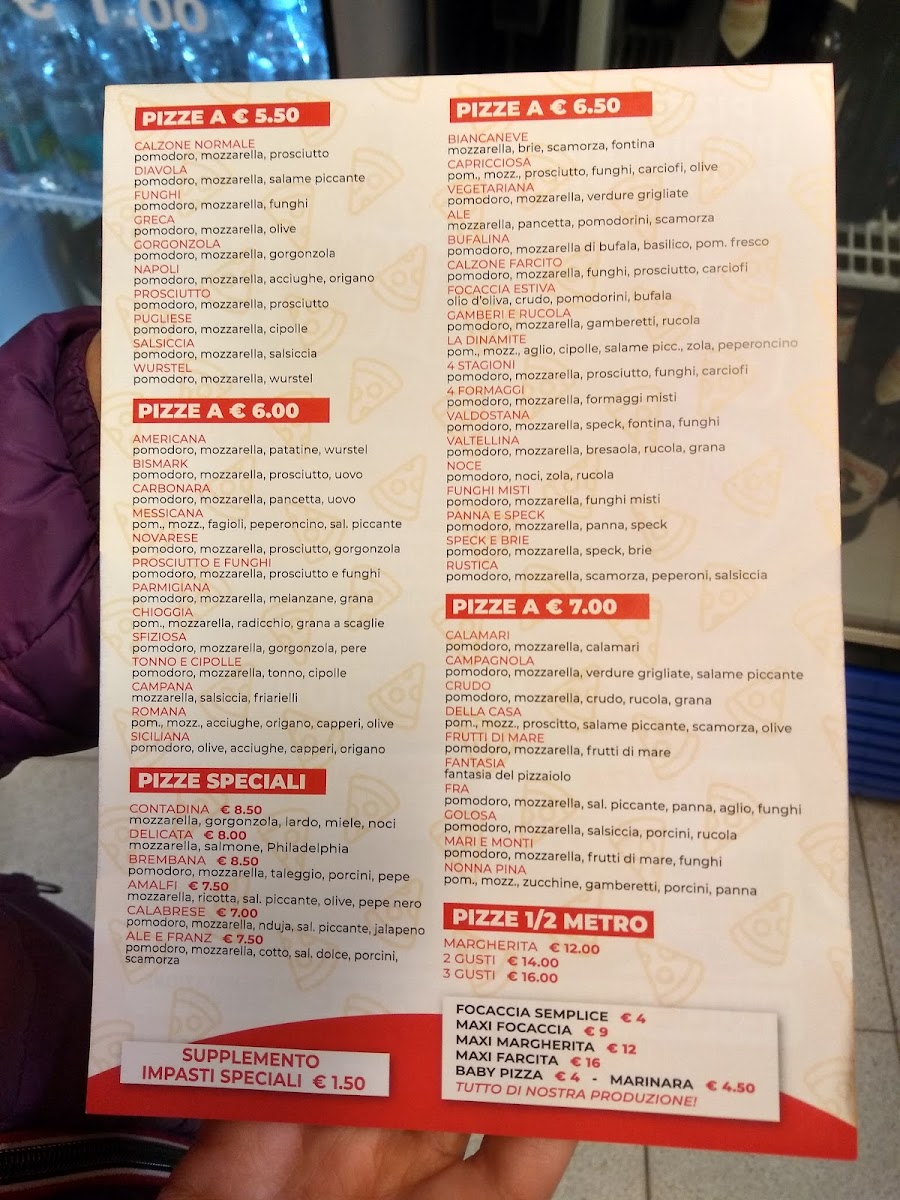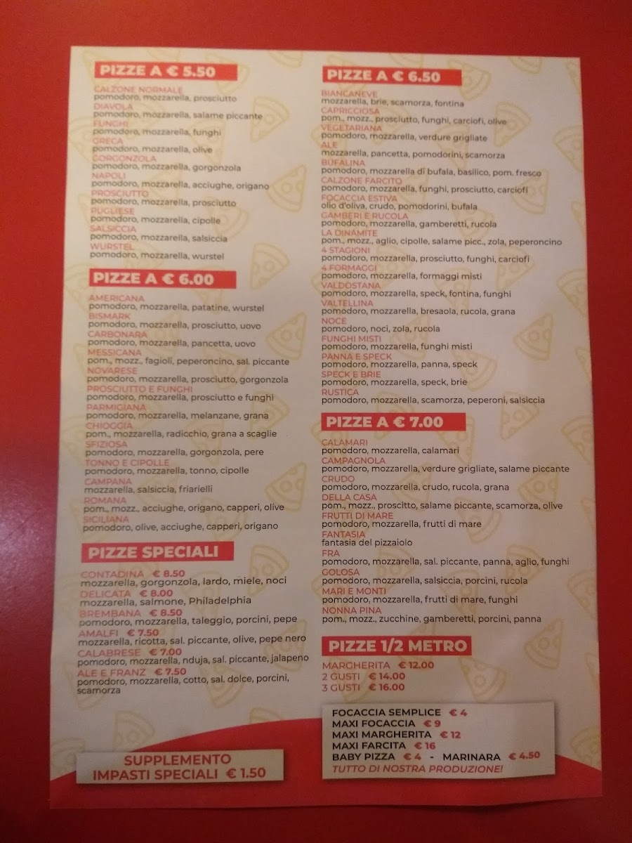 Welcome to Ale & Franz, a charming pizza takeaway nestled in the heart of Novara, Italy. Known for its authentic Italian offerings, the menu boasts a delightful selection of pizzas baked to perfection in a traditional fire oven. Signature creations like the Margherita and the savory Parmigiana showcase fresh, high-quality ingredients such as mozzarella and basil, while innovative toppings provide a creative twist. Prices are remarkably accessible, ensuring that a delicious meal is within everyone's reach.